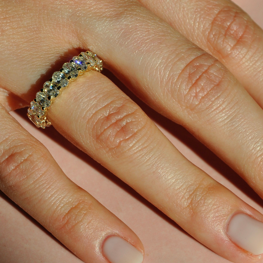 Our Oval Diamond Eternity Ring is pure radiance in motion – a continuous loop of brilliance, crafted to symbolize forever. Featuring hand-selected, IGI-certified oval-cut diamonds set seamlessly around the band, each stone is chosen for its exceptional fire and elongated elegance. Bold yet refined, this ring is a timeless expression of love and craftsmanship – perfect on its own or stacked for maximum impact.